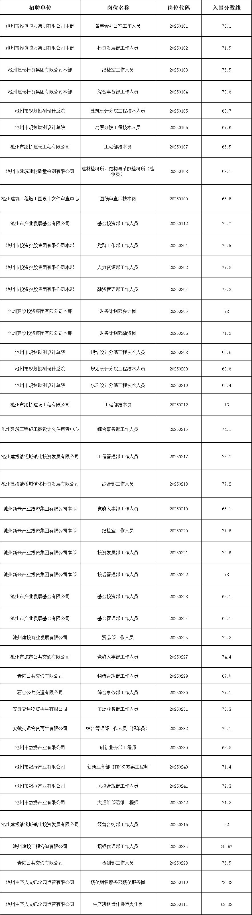 根據(jù)《池州市投資控股集團2025年公開招聘工作人員公告》要求,公開招聘筆試工作已結(jié)束,現(xiàn)將資格復審及面試相關(guān)事宜公告如下。