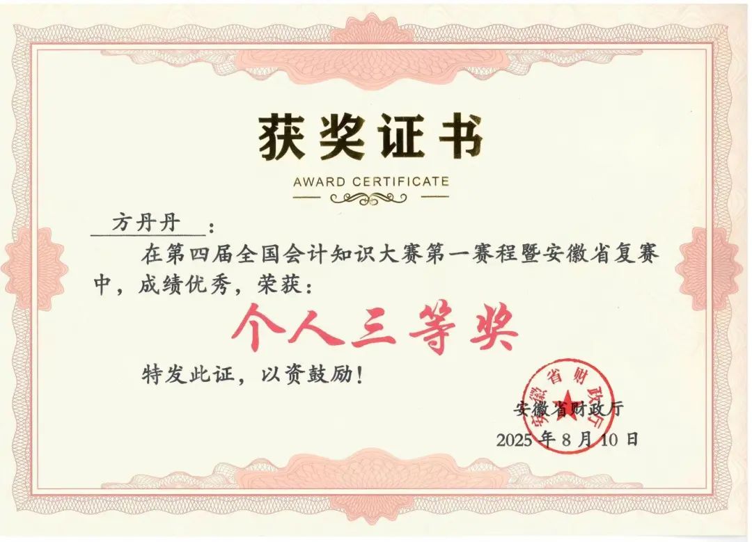 近日,第四屆全國會計知識大賽第一賽程暨安徽省復賽在合肥圓滿落幕。在與全省440名會計英才比拼對決中,集團所屬財務管理公司方丹丹憑借扎實的專業(yè)知識和出色的發(fā)揮,榮獲個人三等獎。