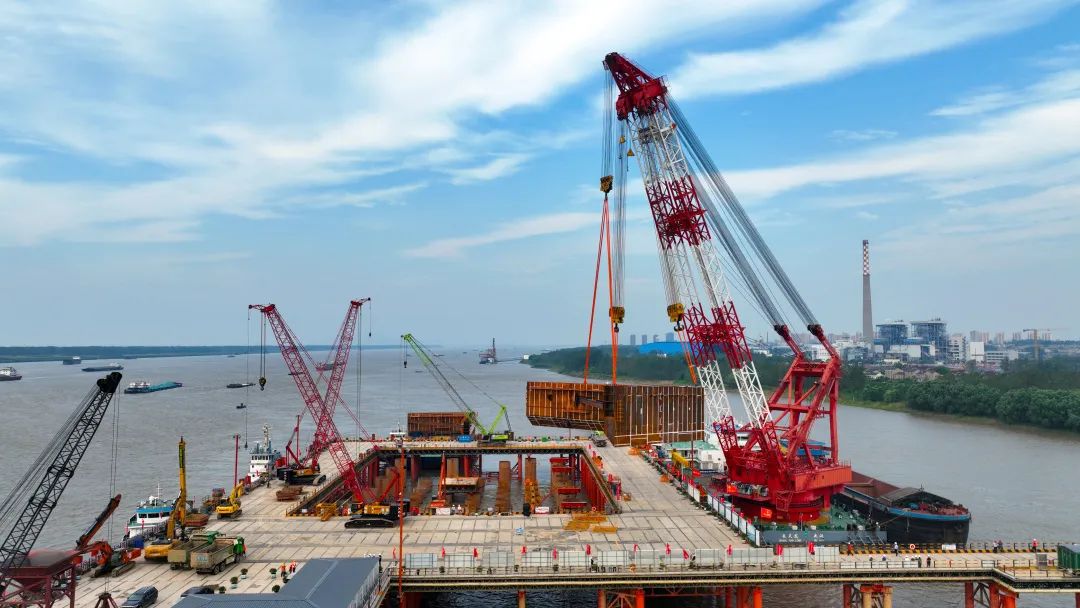 9月4日18時,在距離池州岸約400米的長江江面施工現(xiàn)場,隨著一艘1000噸級吊船平穩(wěn)地將底節(jié)最后一吊鋼圍堰準確下放到位,標志著中鐵大橋局承建的集團“頭號工程”池州長江公鐵大橋南主塔墩(4號墩)大橋南主墩建設率先轉入圍堰施工階段。