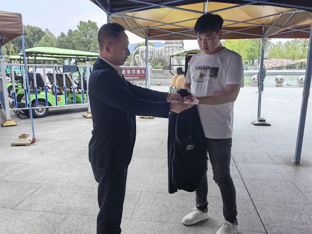 游客胡先生通過景區(qū)工作人員得知自己的外套在觀光車起點(diǎn)站,隨身物品保存完好,十分激動(dòng),收到衣物后連聲道謝。趙小平回應(yīng)稱:“在我們景區(qū),任何一位員工,拾到游客財(cái)物都會(huì)主動(dòng)歸還游客的。”