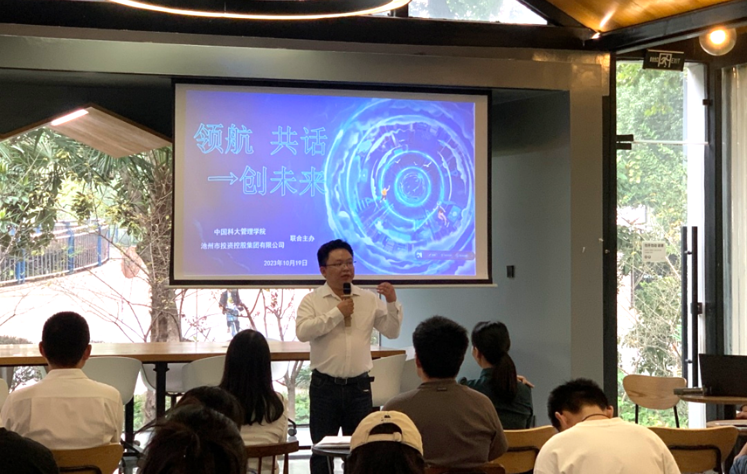 中國科大管理學(xué)院黨委副書記曾皓,池州市投資控股集團(tuán)黨委副書記、董事、工會(huì)主席嚴(yán)艷,中國科大博士學(xué)長、池州新興產(chǎn)投集團(tuán)黨委書記、董事長、總經(jīng)理周嶠,中國科大管理學(xué)院50多名學(xué)生參加了會(huì)議。