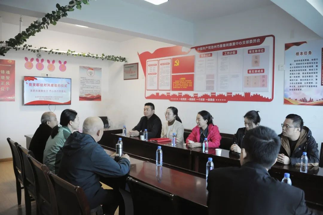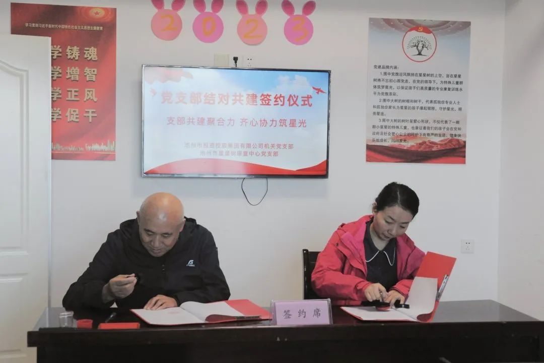 市民政局四級(jí)調(diào)研員張中才,市投控集團(tuán)黨委副書記、機(jī)關(guān)支部書記嚴(yán)艷,市投控集團(tuán)機(jī)關(guān)黨支部支委班子參加簽約儀式。簽約儀式前,池州星星樹康復(fù)中心負(fù)責(zé)人吳靜和市投控集團(tuán)黨委副書記嚴(yán)艷分別就雙方單位情況作了介紹。