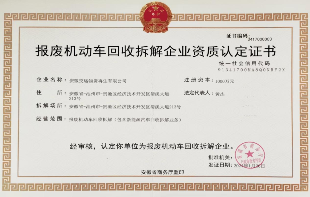 近日,集團(tuán)所屬安徽交運(yùn)物資再生有限公司順利通過安徽省商務(wù)廳批準(zhǔn),成功獲得報(bào)廢機(jī)動車回收拆解企業(yè)資質(zhì)認(rèn)定證書 。